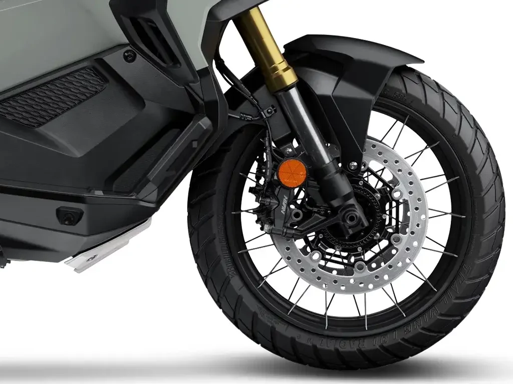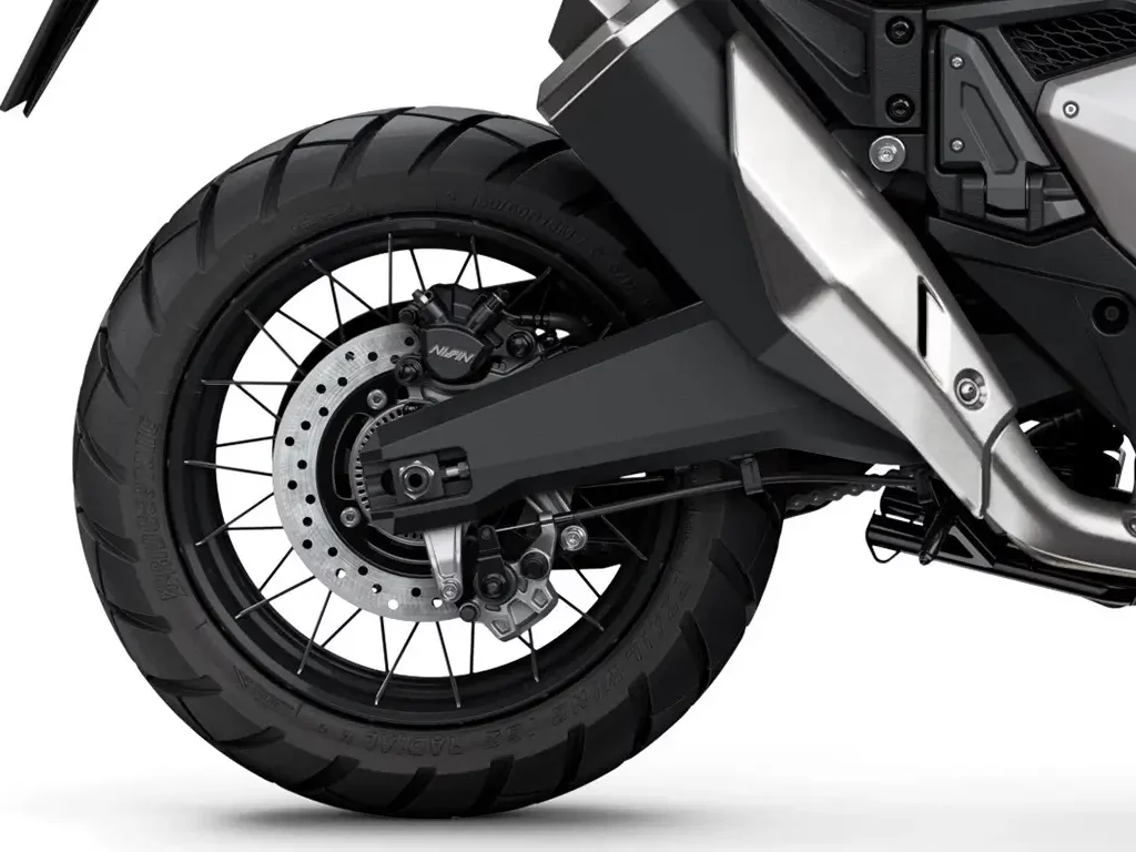 As rodas raiadas da X-ADV têm aro de 17” na dianteira e 15” na traseira, calçadas de pneus de medidas 120/70 na dianteira e 160/60 na traseira. O conjunto traz ainda hastes das válvulas em forma de “L”, que facilitam a verificação da pressão do ar.