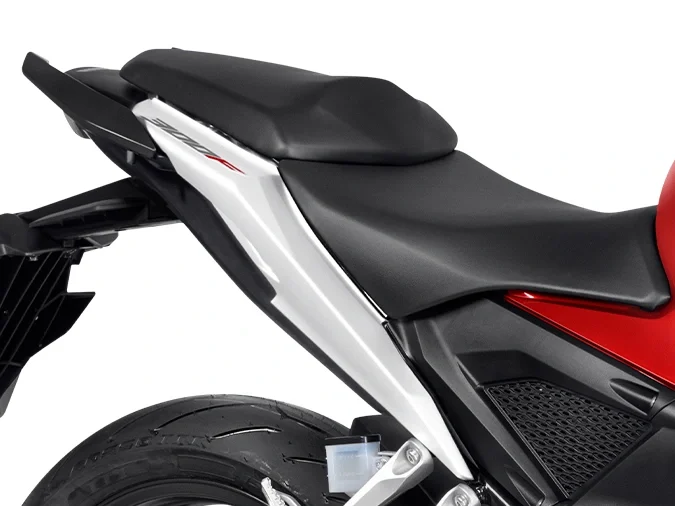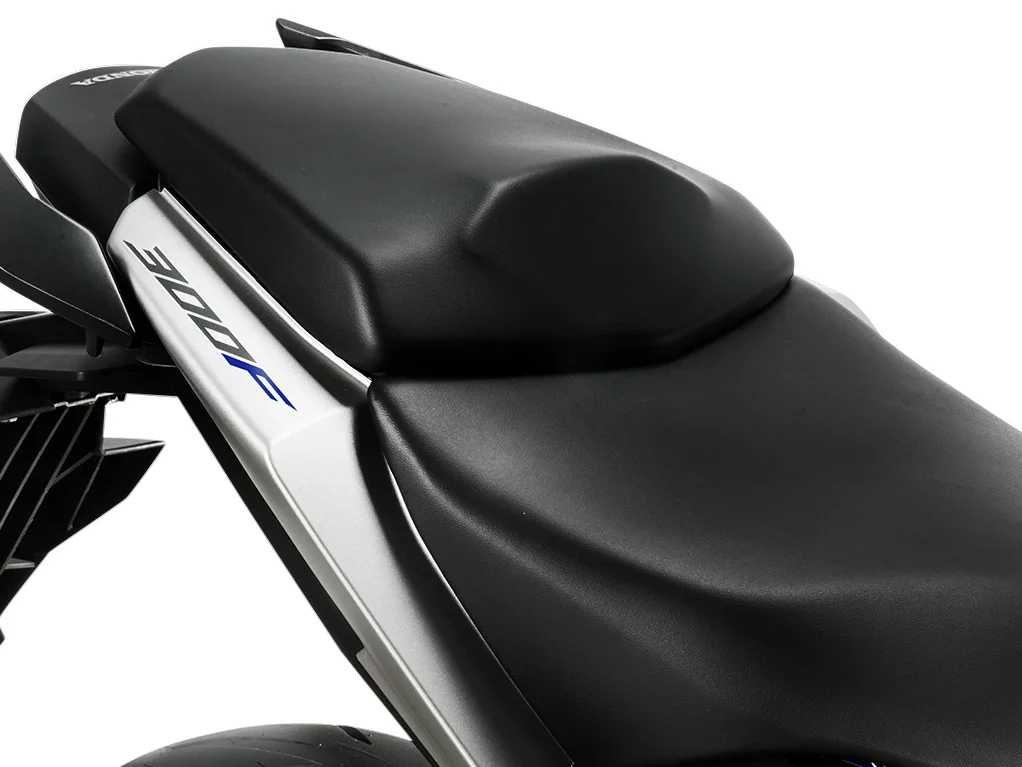 O assento bipartido proporciona conforto tanto para o piloto quanto para o passageiro, além de adicionar uma estética esportiva à motocicleta.