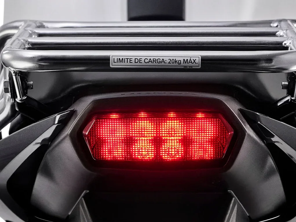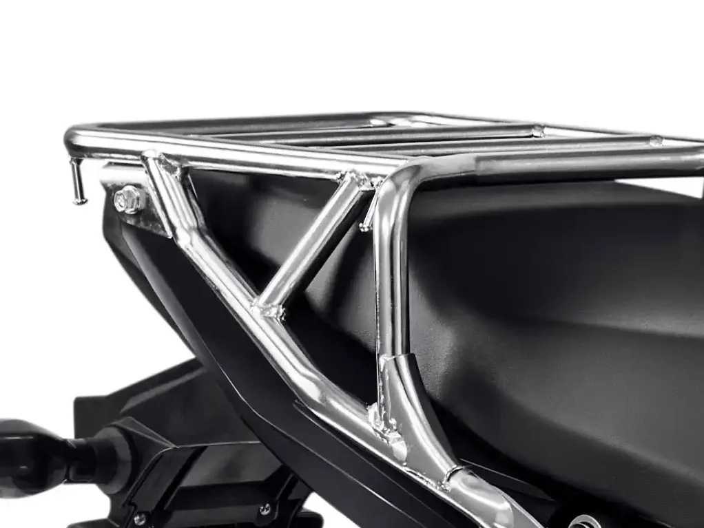 Homologado de fábrica, o bagageiro cromado com capacidade de 20 kg traz comodidade sem deixar de lado a sofisticação.