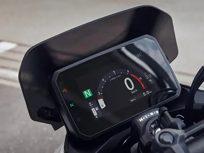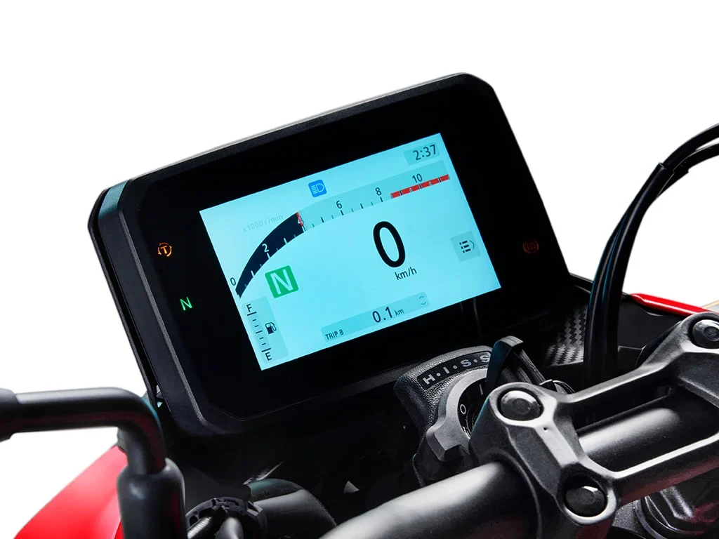 O novo display TFT colorido de 5” da Honda Hornet 500 oferece ótima visibilidade e leitura intuitiva. O painel da moto oferece duas opções de iluminação de fundo, com ajuste automático e diferentes formatos para apresentação dos dados na tela. Tudo isso comandado por um novo seletor multifuncional e retroiluminado.
