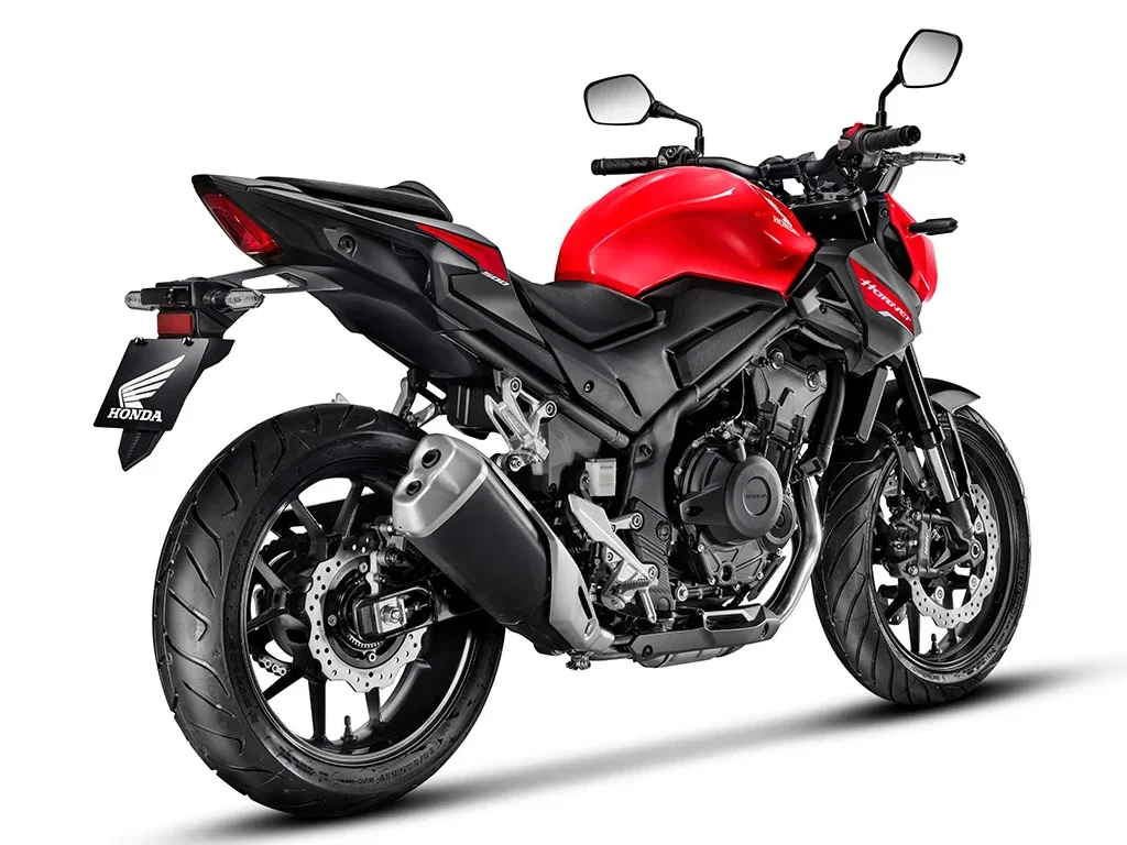 A nova Honda Hornet 500 apresenta um design agressivo e moderno com linhas nítidas que proporcionam uma presença mais marcante.