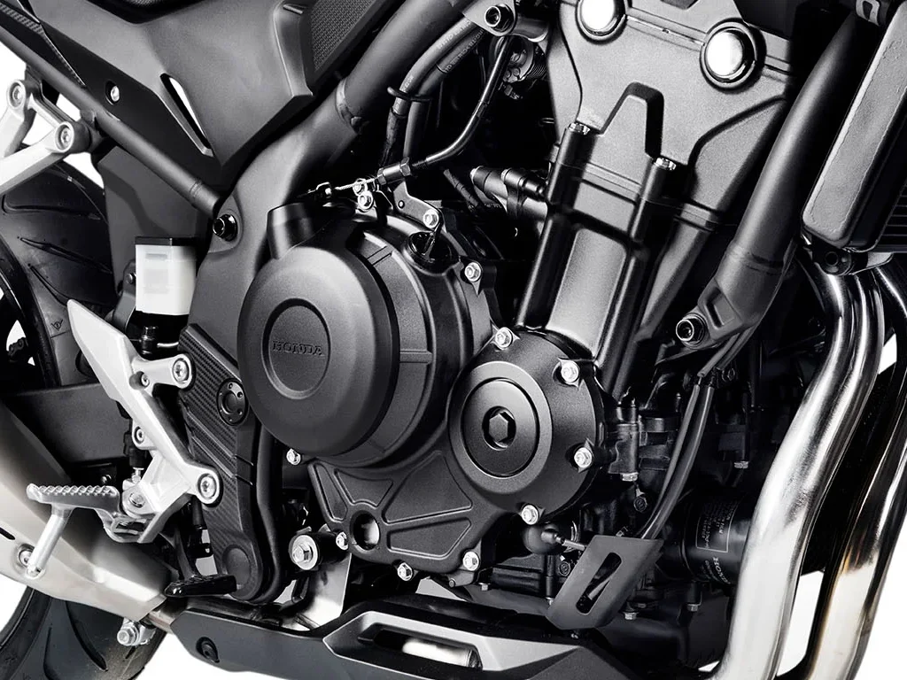 O motor bicilíndrico de 471 cm³ da Honda Hornet 500 possui entrega de torque desde baixas rotações, proporcionando bom desempenho em retomadas e ultrapassagens, além de economia de combustível.